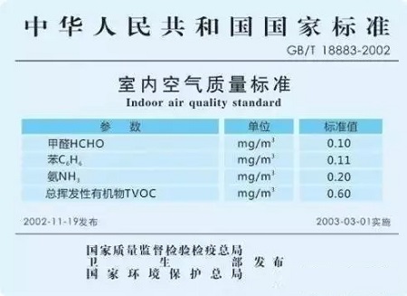 這個(gè)標(biāo)準(zhǔn)是由國(guó)家質(zhì)量監(jiān)督檢驗(yàn)檢疫總局、衛(wèi)生部、國(guó)家環(huán)??偩钟?/span>2002-12-19發(fā)布,2003年3月1日實(shí)施的。在這個(gè)標(biāo)準(zhǔn)里,規(guī)定了室內(nèi)甲醛濃度安全限值不得高于0.1毫克/立方米,是推薦性標(biāo)準(zhǔn),非強(qiáng)制性標(biāo)準(zhǔn)。這個(gè)標(biāo)準(zhǔn)主要用于衡量人居室內(nèi)環(huán)境健康的依據(jù),在這個(gè)標(biāo)準(zhǔn)中不僅有甲醛、苯等裝修有害氣體,也對(duì)物理方面的溫度、濕度、PM2.5等都有規(guī)范要求,涉及到的指標(biāo)有19項(xiàng)。